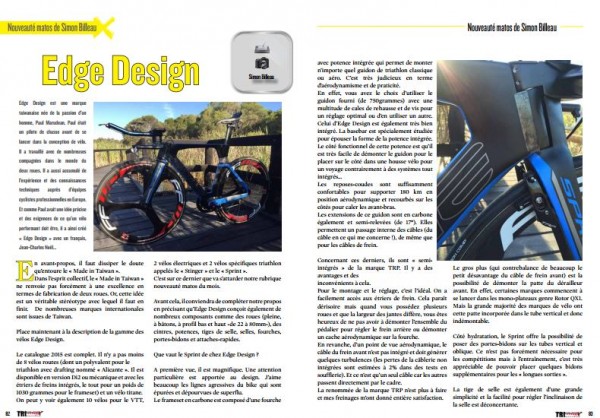 Edge Design est une marque taiwanaise née de la passion d’un homme, Paul Marudean. Paul était un pilote de chasse avant de se lancer dans la conception de vélo. Il a travaillé avec de nombreuses compagnies dans le monde du deux roues. Il a aussi accumulé de l’expérience et des connaissances techniques auprès d’équipes cyclistes professionnelles en Europe. Et comme Paul avait une idée précise et des exigences de ce qu’un vélo performant doit être, il a ainsi créé « Edge Design » avec un français, Jean-Charles Noël…