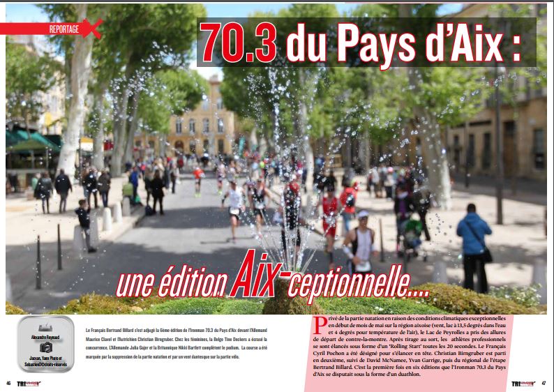 Le Français Bertrand Billard s’est adjugé la 6ème édition de l’Ironman 70.3 du Pays d’Aix devant l’Allemand Maurice Clavel et l’Autrichien Christian Birngruber. Chez les féminines, la Belge Tine Deckers a écrasé la concurrence. L’Allemande Julia Gajer et la Britannique Nikki Bartlett complètent le podium. La course a été marquée par la suppression de la partie natation et par un vent dantesque sur la partie vélo.