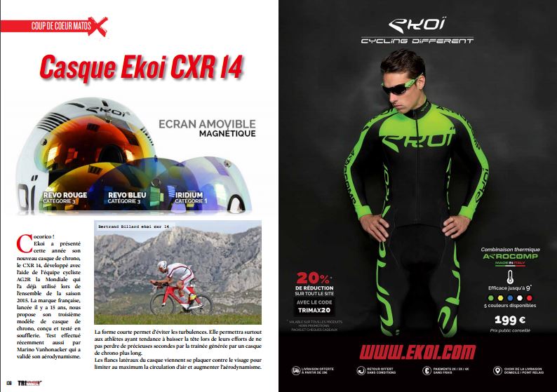 Cocorico ! Ekoi a présenté cette année son nouveau casque de chrono, le CXR 14, développé avec l’aide de l’équipe cycliste AG2R la Mondiale qui l’a déjà utilisé lors de l’ensemble de la saison 2015. La marque française, lancée il y a 15 ans, nous propose son troisième modèle de casque de chrono, conçu et testé en soufflerie. Test effectué récemment aussi par Marino Vanhonacker qui a validé son aérodynamisme.