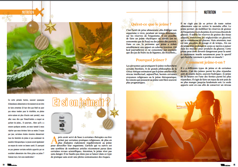 En cette période festive, souvent synonyme d’abondance alimentaire et de moment où on évite de faire attention (il faut dire que Noël ne peut pas mieux tomber pour le triathlète, en pleine entre-saison où plus d’excès sont permis), vous allez vous dire que TrimaX-hebdo a craqué en parlant du jeûne… Et pourtant… Alors qu’il y a encore quelques années, on nous tannait à nous répéter que nous devions faire au moins 3 repas par jour, certaines études récentes démontrent tous les bienfaits du jeûne et pas seulement de manière thérapeutique. Le jeune serait également un moyen de rester en bonne santé. Et pourquoi ne pas gommer certains méfaits apportés par un excédent alimentaire des fêtes grâce au jeûne ? Comme tout, c’est avec modération !