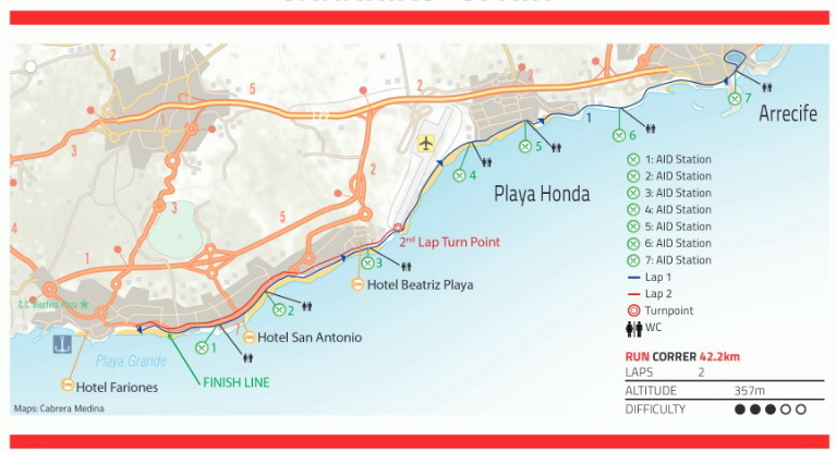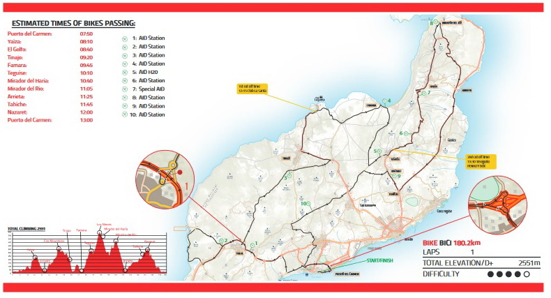 Le parcours natation dans l’Atlantique en 2 boucles avec combinaison néoprène, suivi d’un des plus beau parcours vélo le long des champs de lave, des vignes et des plages de sable en une seule boucle de 180 km où le vent peut jouer un rôle majeur, enfin le marathon le long de la côte en direction de Arrecife, modifié cette année avec un premier aller-retour sur Arrecife de 15km, puis un 2ème aller-retour de 6km.
