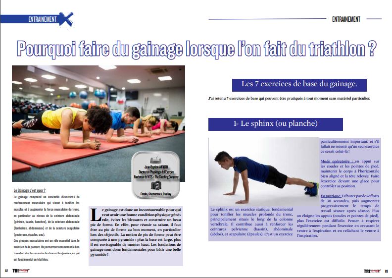 Le Gainage c’est quoi ? Le gainage comprend un ensemble d’exercices de renforcement musculaire qui visent à tonifier les muscles et à augmenter la force musculaire du tronc, en particulier au niveau de la ceinture abdominale (périnée, bassin, hanches), de la ceinture abdominale (lombaires, abdominaux) et de la ceinture scapulaire (pectoraux, épaules, cou). Ces groupes musculaires ont un rôle essentiel dans le maintien de la posture. Ils permettent notamment le bon transfert des forces entre les bras et les jambes, ce qui est fondamental en triathlon.