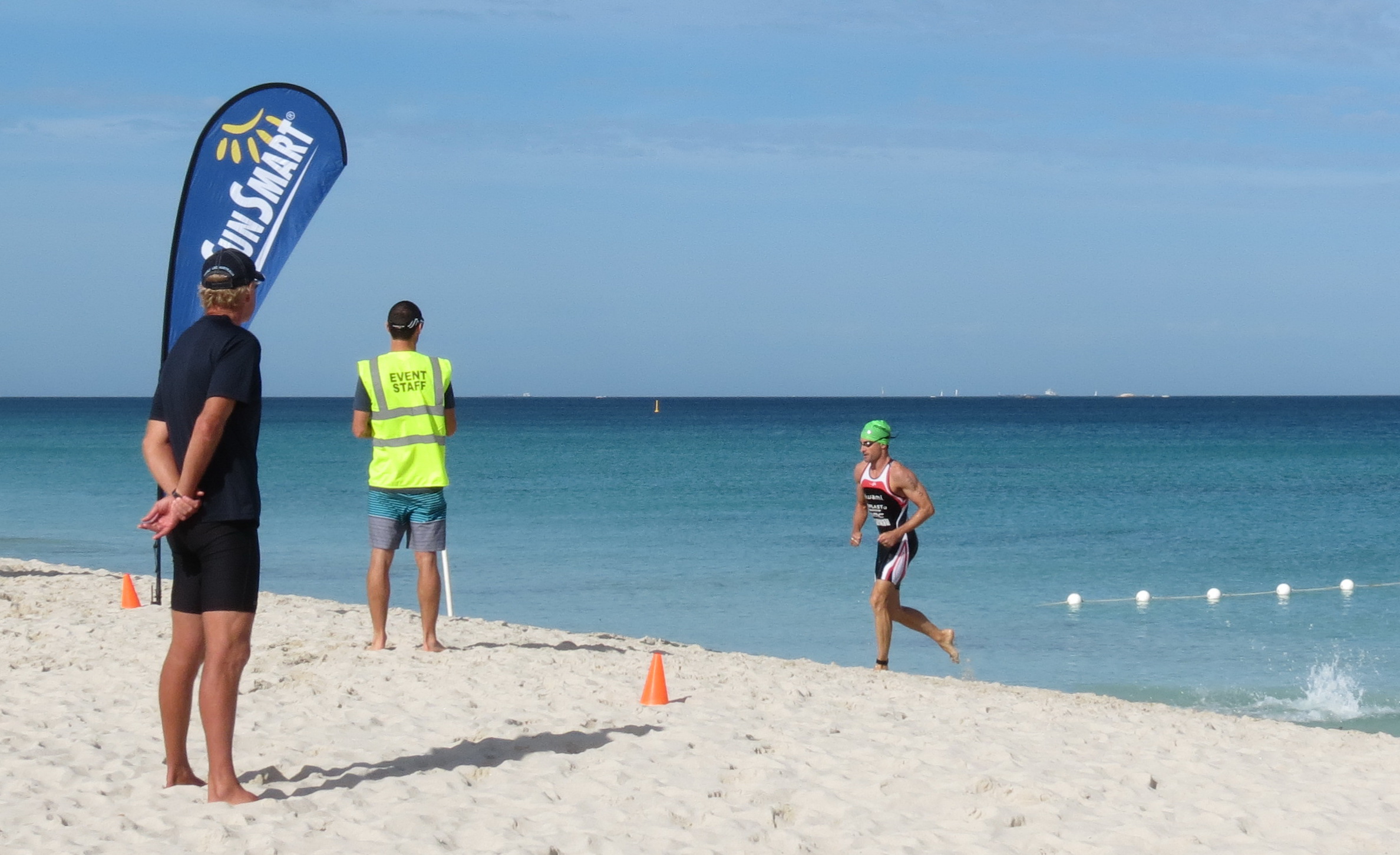 « J’ai bataillé avec 2 petits jeunes qui font du Lifesaving, le sport national en Australie. Les distances étaient 2.5km de course à pied sur la plage, 1km de natation en 2 boucles (un peu plus selon moi!!!lol), et re-2.5km de course à pied. » Simon