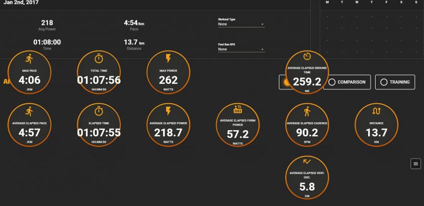 Les principales mesures fournies par le Stryd sont donc : La puissance, L’efficience de course, Temps de contact au sol, Oscillation verticale, Cadence et Distance.
