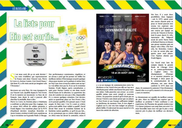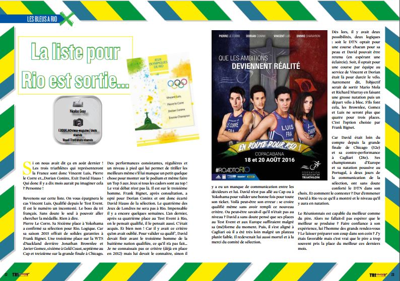 TrimaX#153 vous dévoile la liste pour Rio… Posted by Alex-TrimaX | lundi 13 juin 2016 | Actualités, News | 0 | Si on nous avait dit ça en août dernier ! Les trois triathlètes qui représenteront la France sont donc Vincent Luis, Pierre le Corre et…Dorian Coninx. Exit David Hauss ! Qui donc il y a dix mois aurait pu imaginer cela ? Personne !