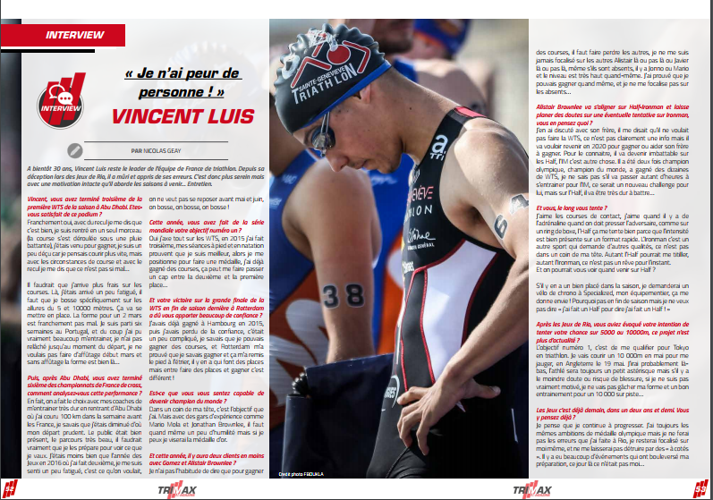 A bientôt 30 ans, Vincent Luis reste le leader de l’équipe de France de triathlon. Depuis sa déception lors des Jeux de Rio, il a mûri et appris de ses erreurs. C’est donc plus serein mais avec une motivation intacte qu’il aborde les saisons à venir… Entretien.