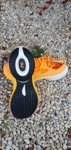 Ne disposant pas de plaque carbone, la KD900 se positionne comme une chaussure polyvalente, mais au caractère affirmé doté d’un fort dynamisme. Les sensations sont « relativement » proches des quelques modèles plaque carbone que nous avions testés. Il serait d’ailleurs intéressant de tester la version KD900X, chose que nous ne manquerons pas de faire chez Trimax. Ce dynamisme vient en grande partie de ce design particulier du talon inspiré d’un donut, permettant d’optimiser la déformation de la matière pour redonner un maximum d’énergie.