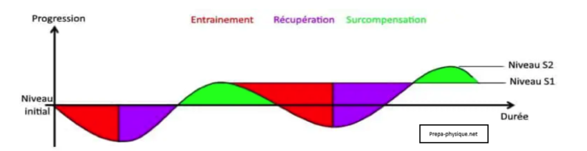 C’est durant ces phases de repos, plus ou moins totales, que notre corps “surcompense”. L’enchaînement de phases de sollicitations “efforts” et de repos permet progressivement d’élever son niveau de forme.