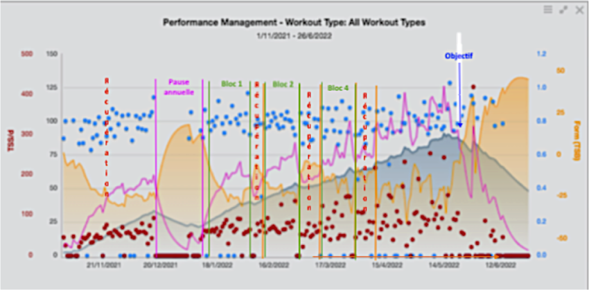 Sur ce graphique on distingue bien les différentes phases d’entraînement qu’a suivi l’athlète durant la saison. On perçoit clairement la montée en charge progressive via le Fitness (courbe bleue) et la fatigue (courbe rose). On remarque également la phase d’affutage juste avant l’objectif avec la remontée de la Form (courbe jaune).