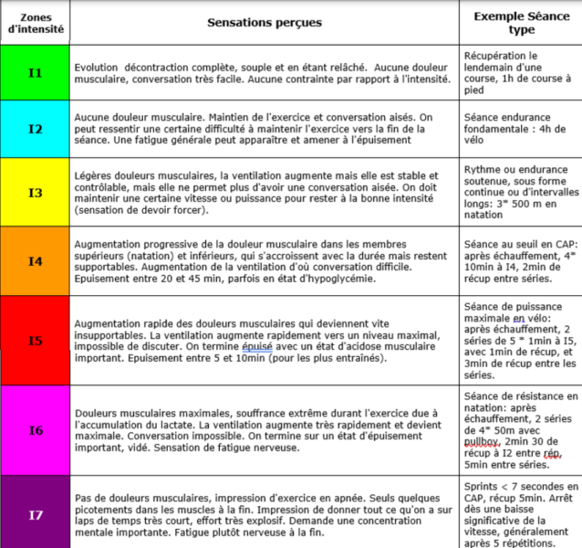 En France, on utilise plutôt l’échelle d’intensité ESIE (Echelle Subjective de l’Intensité de l’Entraînement ; Grappe and all. 1999) qui est actuellement un des moyens les plus complets pour déterminer précisément les différentes intensités d’entraînement. Cette méthode permet aussi d’évaluer la charge d’entraînement réalisée ainsi que l’impact physiologique et psychologique de cette charge. Elle va permettre d’une part de doser l’entraînement, et d’autre part d’utiliser les mêmes intensités dans chaque discipline, lesquelles comportent chacune des spécificités différentes.