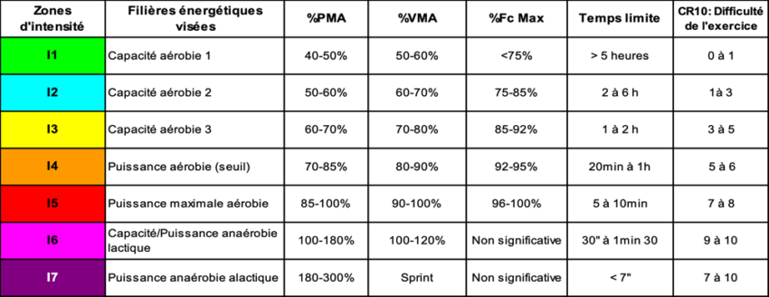 Ensuite, il est possible de déterminer les 7 zones à partir des résultats des tests. L’échelle ESIE est divisée en 7 zones, de I1 à I7, qui correspondent chacune à une intensité différente, chaque intensité renvoyant à des filières énergétiques précises, déterminées en fonction de la perception de l’effort , de la puissance développée et de la fréquence cardiaque.