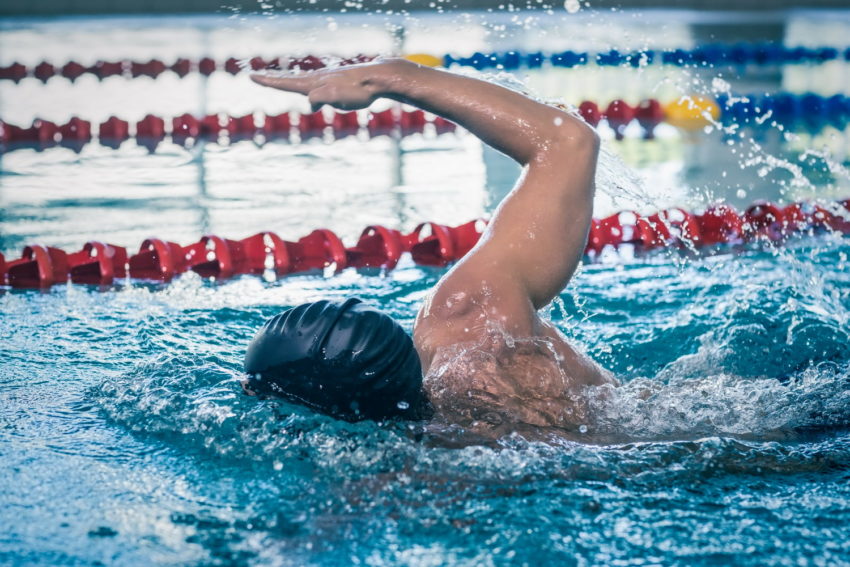 La natation est la 1ère épreuve d’un triathlon. C’est en général une natation en eau libre (océan, rivière, lac). Elle présente le souci au départ d’avoir un grand nombre d’athlètes dans un petit périmètre. Le passage de la 1ère bouée est également délicat car les triathlètes se « battent » pour passer le plus rapidement possible. La température de l’eau est souvent froide. Heureusement, le port de la combinaison néoprène réduit les risques d’hypothermie. Pour comprendre les mécanismes des blessures en natation, il faut connaître les phases biomécaniques de la nage en crawl. Le crawl peut être divisé en 2 phases : la phase propulsive et la phase de retour aérien ou de récupération. Lors de la phase propulsive, la main entre dans l’eau et l’épaule passe par une adduction continue et une rotation interne. Hors de l’eau, la phase de retour aérien implique une abduction et une rotation externe de l’épaule.Le trajet de la main dans l’eau est décrit comme un « S » pour propulser le corps le plus efficacement possible. La loi de Bernoulli décrit la force de portance hydrodynamique. La coiffe des rotateurs, particulièrement le tendon supra-épineux, est à risque dans ce geste répétitif.Le biceps est aussi vulnérable lors de la phase de récupération.