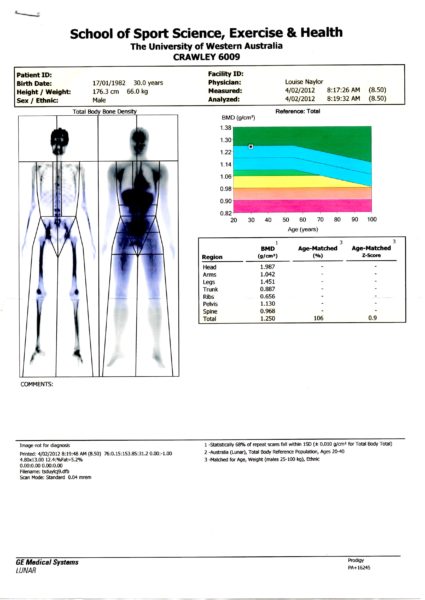 On a donc évalué sur une semaine complète quelles étaient mes dépenses et recettes énergétiques. En clair, je notais et pesais tout ce que je mangeais et buvais sur une semaine complète. De l’autre côté de la balance, je consignais tous mes entraînements et courbes d’analyses de fréquence cardiaque. Nathalie avait calculé à l’époque que je dépensais autour des 7000 calories par jour, mais que mon alimentation malgré les nombreuses collations n’apportaient que 6000 calories. Il a fallu établir un programme nutritionnel adapté à ma pratique. Le DEXA avait également montré que, quand bien même mon contenu minéral osseux était dans la norme, il était dans la limite basse. Ceci est un indice annonciateur d’un surentraînement qui pourrait engendrer une fracture de fatigue. Deux endroits sont analysés par la machine, le col du fémur et le bas du dos.