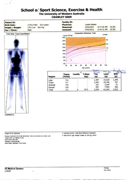 Le DEXA, initialement développée dans les années 80 pour la mesure du contenu minéral osseux, s’est imposée comme la méthode de référence pour l’étude de la composition corporelle. Elle consiste à balayer l’ensemble du corps avec un faisceau de rayons X à deux niveaux d’énergie. Le rapport des atténuations de ces deux rayonnements est fonction de la composition de la matière traversée. L’irradiation imposée au patient est faible et similaire à celle correspondant à une radiographie pulmonaire. La calibration est effectuée avec des fantômes artificiels contenant des triglycérides et du calcium. Le DEXA permet de séparer trois compartiments (masse grasse, masse maigre et contenu minéral osseux) par un traitement informatique des mesures physiques. La précision est excellente. le DEXA mesure la valeur du compartiment osseux, négligé jusque-là. Le balayage du corps entier et le traitement d’images permettent une approche régionale (bras, tronc, jambes) des trois compartiments mesurés, impossible à réaliser avec les autres méthodes. J’ai eu l’occasion d’en refaire un en Australie lorsque je m’entraînais avec l’Unviersity Western Australia avant mon accident.