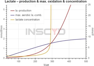 Le point de croisement de la production de lactate (rouge, déterminé par le VLamax) et de la combustion de lactate (bleu, déterminé par le VO2max) est souvent appelé le seuil anaérobie (FTP).