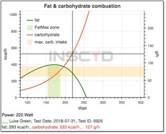 Dans cet exemple, l’athlète du graphique a un stock de glucides de 250 grammes dans ses muscles. Les résultats du test INSCYD montrent qu’il peut maintenir cette intensité pendant 2 heures, puisqu’il brûle ~125 grammes de glucides par heure à cette intensité. Si son épreuve dure plus de 2 heures, il doit choisir au moins une des 3 options. Première option : il peut diminuer son intensité pour s’assurer qu’il brûle moins de glucides. Deuxième option : il peut consommer des glucides pendant l’exercice pour s’assurer d’avoir plus de glucides dans son corps afin de fournir de l’énergie. Troisième option : il peut utiliser INSCYD pour s’assurer que son plan d’entraînement le rend plus « adapté aux graisses », afin qu’il soit capable de brûler plus de graisses et moins de glucides.