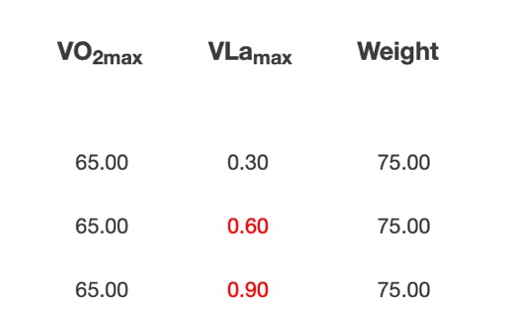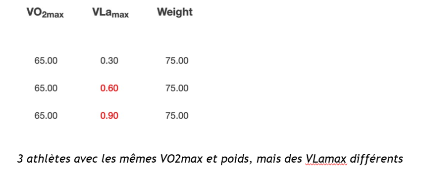 Le triathlète ayant un faible VLamax de 0,30 mmol/l/s aura un seuil anaérobie (FTP) de 342 watts. Le triathlète ayant un VLamax plus élevé de 0,60 mmol/l/s aura un seuil anaérobie de 297 watts. Enfin, le troisième triathlète ayant un VLamax de 0,90 mmol/l/s aura un seuil anaérobie de 260 watts. Ces trois différences de VLamax ne sont pas rares.