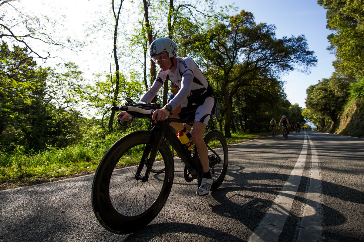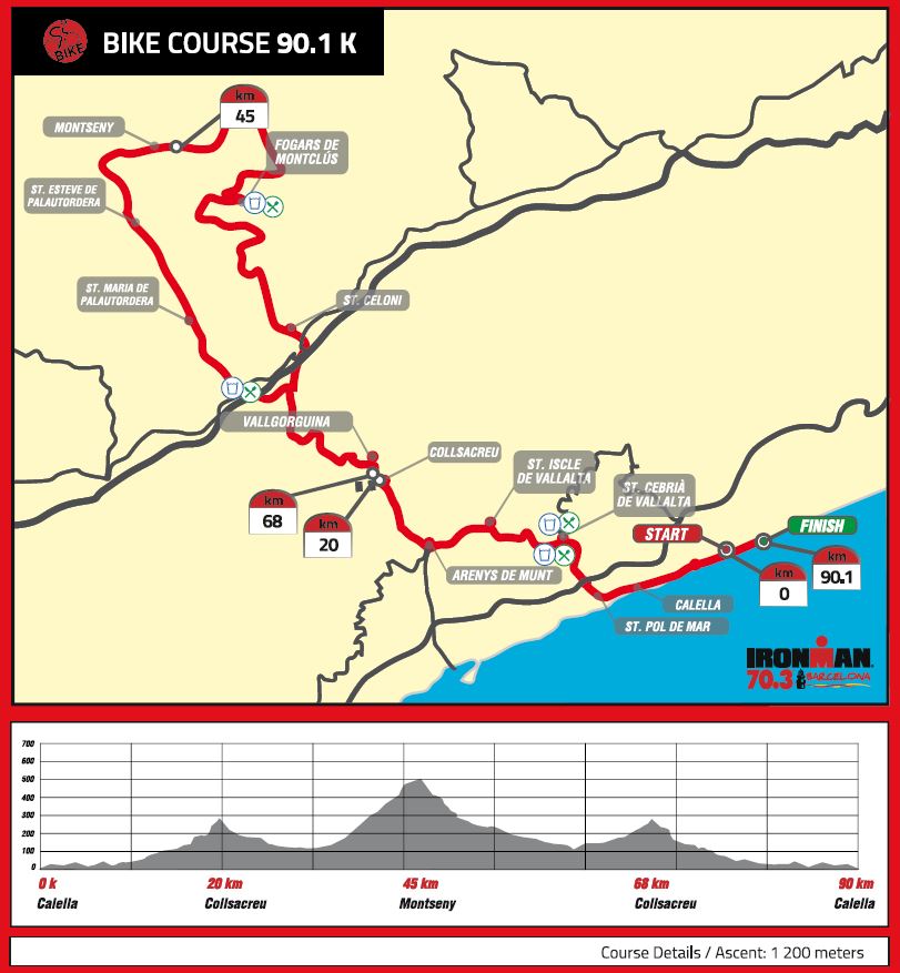 Puis les concurrents enfourcheront leur vélo pour 90 km vers l’intérieur des terres, sur des routes fermées. Ce parcours vélo est un vrai challenge puisqu’il n’est pas plat tout en restant accessible (1200 mètres de dénivelé). Les concurrents ne devront pas trop laisser d’énergie pour avoir la lucidité nécessaire pour admirer le paysage qui s’offrira à eux avec un partie dans le Parc Naturel du Montnegre intégré à la Cordillère littorale.