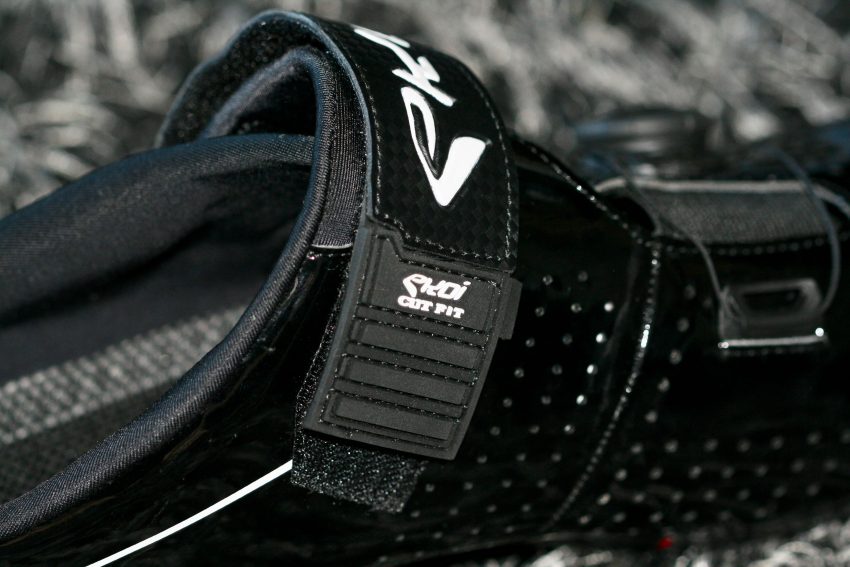 Une fois le tour du propriétaire effectué, il est temps d’enfiler ces TR1. Le revêtement intérieur se révèle assez doux et confortable. L’ajustement se fait en deux points. Tout d’abord un système de serrage par disque sur l’avant du pied. Pas de Boa ici, mais une solution concurrente, Atop. On serre dans en tournant vers l’avant, on débloque le système en tournant vers l’arrière. Le seul petit inconvénient est que si vous avez serré un petit peu trop, vous ne pouvez pas desserrer juste le nécessaire, il faut débloquer complètement puis resserrer. Pour le serrage principal, et afin de garantir en temps d’enfilage plus rapide, on retrouve un serrage par sangle muni d’un grand scratch. La chaussure peut donc être grande ouverte pour l’enfilage puis très rapidement refermée. Si vous avez le pied fin, il est possible de recouper l’extrémité de la sangle pour qu’elle ne vienne pas frotter contre vos manivelles.