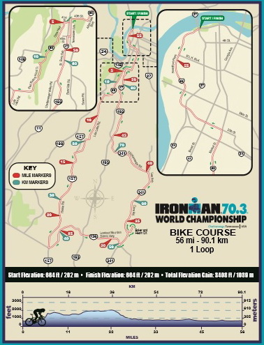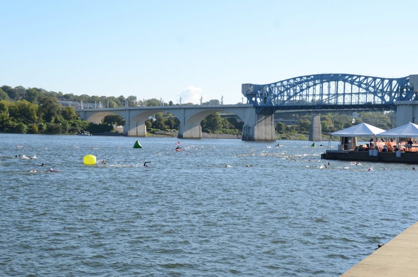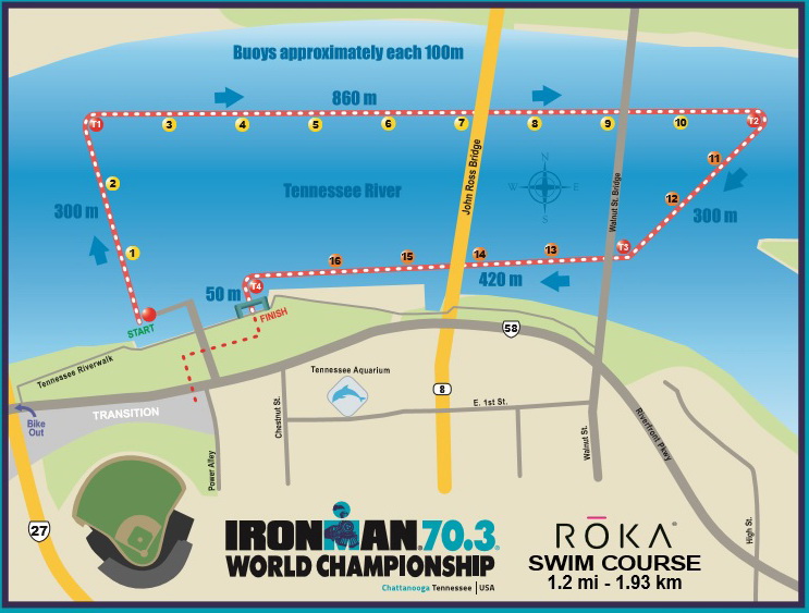 En natation une boucle de 1900m dans le Tennessee, avec départ d’un ponton pour les pros et en « rolling start » par vague pour les amateurs. Un fort courant de face à l’aller et sans doute une natation sans combinaison car l’eau est à plus de 25°C.