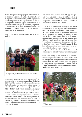UNSS Il faut dire que cette équipe particulièrement ex- Les Versaillaises quant à elles ont appliqué par- périmentée a dominé de la tête et des épaules les faitement la stratégie prévue avant la course avec 36 équipes du plateau lycéens (dont 10 équipes de leur professeur d’EPS et font un énorme 1er tour «Section Sportive»). Elle se paie même le luxe de qui permet à l’équipe Marie-Curie de prendre la battre pour la 3ème fois (après le «Run Bike» et le tête de la course avec 15» d’avance. duathlon de l’académique de Versailles) l’équipe du lycée Michelet de Vanves pourtant sacrée CHAM- A partir de ce moment-là, les garçons versaillais PIONNE DU MONDE SCOLAIRE de triathlon à ainsi rassurés ont fait exploser leur talent en creu- Porto Rico en octobre dernier... sant l’écart pour le faire monter à plus de 40». Le 2ème relais filles a été un peu plus compliqué C’est dire le niveau du lycée Marie-Curie de Ver- malgré un début de course très rapide permet- sailles ! tant au lycée Marie-Curie d’atteindre la minute d’avance. C’est à ce moment-là que la paire «Lou - Elise» prenait des risques sur la 2ème moitié de la boucle où les 2 déposes vélos étaient très éloi- gnées. Avec cette erreur c’était 30» de perdu dans l’inversion des rôles «coureur-rouleur» avec im- possibilité de faire du main à main... Le spectacle était relancé car le lycée Michelet et 2 autres équipes étaient revenues presqu’au contact ! C’était sans compter sur le talent et la détermi- nation des garçons de tuer la course. Ils faisaient un tour parfait et augmentaient leur avance ! Le dernier tour des filles comme celui des garçons étaient parfaits et permettaient à Elise de franchir la ligne d’arrivée avec plus d’une minute d’avance ! Marie-Curie était au zénith ! L’équipe du Lycée Marie Curie et leur prof d’EPS Et pourtant, les choses n’avaient pourtant pas bien commencé avec notamment une chute de Krilan LE BIHAN dès le début de la boucle de lancement à pied. Résultat des courses un retour au parc à vélo à la 20ème place ! Corentin QUINET sur le VTT a du faire parler toute son expérience pour se frayer un passage et remonter en tête de course en vélo. Malheureusement, pendant ce temps- là les 5 premières équipes prenaient de l’avance. Dans cette boucle, Krilan LE BIHAN, gêné par un concurrent faisait une nouvelle chute en VTT. Le binôme «QUINET-LE BIHAN» parvenait quand même a passé le relais aux filles à seulement 12 « de la tête de course. VTT Garçons 12