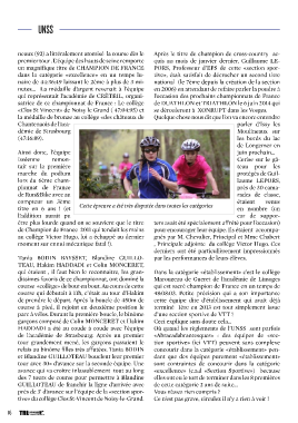 UNSS neaux (92) a littéralement atomisé la course dès le Après le titre de champion de cross-country ac- premier tour . L’équipe des hauts de seine remporte quis au mois de janvier dernier, Guillaume LE- un magnifique titre de CHAMPION DE FRANCE PORS, Professeur d’EPS de cette «section spor- dans la catégorie «excellence» en un temps lu- tive», était satisfait de décrocher un second titre naire de 44:36:49 laissant le 2ème à plus de 3 mi- national (le 7ème depuis la création de la section nutes... La médaille d’argent revenait à l’équipe en 2006) en attendant de refaire parler la poudre à qui représentait l’académie de CRÉTEIL, organi- l’occasion des prochains championnats de France satrice de ce championnat de France : Le collège de DUATHLON et TRIATHLON le 6 juin 2014 qui «Clos St Vincent» de Noisy le Grand ( 47:04:95) et se dérouleront à XONRUPT dans les Vosges. la médaille de bronze au collège «des châteaux de Quelque chose nous dit que l’on va encore entendre Chantenaois de l’aca- parler d’Issy les démie de Strasbourg Moulineaux sur (47:16:89). les bords du lac de Longemer en Ainsi donc, l’équipe juin prochain... isséenne remon- Cerise sur le gâ- tait sur la première teau pour les marche du podium protégés de Guil- lors du 6ème cham- laume LEPORS, pionnat de France près de 30 cama- de Run&Bike avec au rades de classe, compteur un 3ème étaient venus titre en 6 ans ! (et Cette épreuve a été très disputée dans toutes les catégories en nombre (un l’addition aurait pu car de suppor- être plus lourde quand on se souvient que le titre ters avait été spécialement affrété pour l’occasion) de Champion de France 2011 qui tendait les mains pour encourager leur équipe. Ils étaient accompa- au collège Victor Hugo, lui a échappé au dernier gnés par M. Chevalier, Principal et Mme Chabert moment sur ennui mécanique fatal !). , Principale adjointe du collège Victor Hugo. Ces derniers ont été particulièrement impressionnés Tania BODIN BAYSSET, Blandine GUILLO- par les performances de leurs élèves. TEAU, Hakim HADDADI et Colin MONCERET, qui étaient , il faut bien le reconnaitre, les gran- Dans la catégorie «établissement» c’est le collège dissimes favoris de ce championnat, ont dominé la Marouzeau de Gueret de l’académie de Limoges course «collège» de bout en bout. Au cours de cette qui est sacré champion de France en un temps de course qui débutait à 11h, c’était au tour d’Hakim 48:08:03. Petite précision qui a son importance de prendre le départ. Après la boucle de 450m de cette équipe dite d’établissement qui avait déjà course à pied, il rejoint en deuxième position le terminé 1ère en 2013 est tout simplement issue parc à vélos. Durant la première boucle, le binôme d’une section sportive de VTT ! garçons composé de Colin MONCERET et Hakim Ceci explique sans doute cela... HADDADI a été au coude à coude avec l’équipe Où quand les règlements de l’UNSS sont parfois de l’académie de Strasbourg. Après un premier «Abracadabrantesques» : des équipes de «sec- tour grandement mené, les garçons passaient le tion sportive» (ici VTT) peuvent sans complexe relais au binôme filles très affutées. Tania BODIN concourir dans la catégorie «établissement» pen- et Blandine GUILLOTEAU bouclent leur premier dant que des équipes purement «établissement» tour avec 30» d’avance sur la seconde équipe. Une sont contraintes de concourir dans la catégorie avance qui va croître inlassablement tout au long «excellence» (c.a.d «Section Sportive») because des 7 tours de course pour permettre à Blandine elles ont eu le tort de terminer dans les 8 premières GUILLOTEAU de franchir la ligne d’arrivée avec de cette catégorie 2 ans de suite... près de 3’ d’avance sur l’équipe de la «section spor- Vous n’avez rien compris ? tive» du collège Clos St-Vincent de Noisy-le-Grand. Ce n’est pas grave, circulez il n’y a rien à voir ! 16