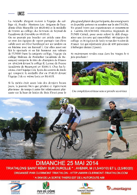 UNSS La médaille d’argent revient à l’équipe du col- plus grand plaisir des participants, des enseignants lège «A. Frank» Morieres Les Avignon de l’aca- et du public présent en nombre sur le site l’UCPA. démie d’Aix Marseille (en 48:30:66) et la médaille Un grand bravo aux organisateurs et notamment de bronze au collège «Le Semnoz» de Seynod de à Laëtitia GUICHARD, Directrice Régionale de l’académie de Grenoble en 49:03:43. l’UNSS Créteil, pour avoir relevé le défi d’orga- On ne pouvait pas boucler cet article sans dire niser une épreuve qui rassemblait 40 équipes de un mot des équipes de «sport partagé» (un élève collège et 36 équipes de lycée venus des 4 coins de valide avec un élève handicapé sur un tandem ou France (ce qui représente plus de 400 personnes en binôme avec un fauteuil ). Car elles aussi ont à héberger durant 2 jours). fait le spectacle et on fait honneur aux valeurs de l’UNSS! Dans la catégorie collège, l’équipe du Et maintenant rendez-vous dans les Vosges le 6 collège Malraux de Pontarlier (académie de Be- juin prochain ! sançon) remporte le titre de champion de France en 45:42:68 devant le collège E. Laroue de Frasne (académie de Besançon) en 53:06:11. Chez les ly- céens, c’est l’équipe 1 du lycée du «centre de Jard» qui remporte la médaille d’or en 37:41:33 devant l’équipe 2 de ce même lycée en 50:41:15. Si la météo était assez loin des derniers beaux jours, la journée bien que grisâtre et légèrement pluvieuse de temps à autre fut relativement plai- sante sur la base de loisirs du Bois Fleuri pour le Une compétition sérieuse sans se prendre au sérieux 18