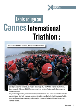 REPORTAGE Tapis rouge au Cannes International Triathlon : Texte par Nicolas MAZETIER avec Jacvan, photos Jacvan et Pierre Mouliérac CANNES, la croisette, le festival, les stars, le tapis rouge et..... Le CANNES international triathlon... Après une année d’absence, CANNES a donc renoué avec le triple effort et pour la circonstance, le tapis a été déroulé ! Une première organisation parfaitement réussie, nous attendions tous de voir ce qu’il allait nous être proposé et de ce côté-là, je pense que personne n’a pu être déçu. Certes tout est toujours perfectible et sur une épreuve d’une telle envergure il est toujours compliqué, voire difficile, de faire un sans- faute dès le début. 29