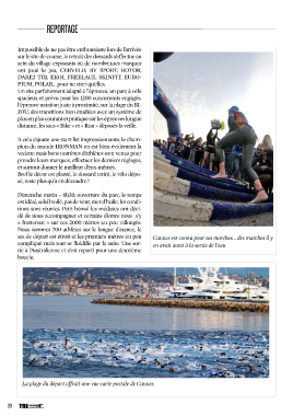 REPORTAGE Impossible de ne pas être enthousiaste lors de l’arrivée sur le site de course, le retrait des dossards s’effectue au sein du village exposants où de nombreuses marques ont joué le jeu, CERVELO, BV SPORT, ROTOR, DARE2 TRI, EKOI, FREELACE, SKINFIT, EURO- PIUM, POLAR… pour ne citer qu’elles. Un site parfaitement adapté à l’épreuve, un parc à vélo spacieux et prévu pour les 1200 concurrents engagés, l’épreuve natation juste à proximité, sur la plage du BI- JOU, des transitions bien étudiées avec un système de plus en plus courant et pratique sur les épreuves longue distance, les sacs « Bike » et « Run » déposés la veille. A cela s’ajoute une start-list impressionnante, le cham- pion du monde IRONMAN en est bien évidement la vedette mais bons nombres d’athlètes sont venus pour prendre leurs marques, effectuer les derniers réglages, et surtout donner le meilleur d’eux-mêmes. Bref le décor est planté, le dossard retiré, le vélo dépo- sé, reste plus qu’à en découdre ! Dimanche matin – 6h30, ouverture du parc, le temps est idéal, soleil voilé, pas de vent, mer d’huile, les condi- tions sont réunies. Petit bémol les méduses ont déci- dé de nous accompagner et certains d’entre nous s’y « frotteront » sur ces 2000 mètres un peu rallongés. Nous sommes 700 athlètes sur le longue distance, le sas de départ est étroit et les premiers mètres un peu Cannes est connu pour ses marches... des marches il y compliqué mais tout se fluidifie par la suite. Une sor- en avait aussi à la sortie de l’eau tie à l’Australienne et c’est reparti pour une deuxième boucle. La plage du départ offrait une vue carte postale de Cannes 30