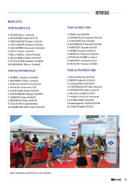 REPORTAGE RESULTS : TOP 10 MEN LD TOP 10 MEN MD 1. FAURE Herve 03:36:45 1. SHAW Asa 02:09:56 2. MOLINARI Giulio 03:37:15 2. FAVRE FELIX Damien 02:11:25 3. FERNANDEZ Nicolas 03:37:25 3. CODDENS Kris 02:11:40 4. VAN LIERDE Frederik 03:37:35 4. BOURSEAUX Yannick 02:13:49 5. DEGASPERI Alessandro 03:40:08 5. FREVENT Sylvain 02:15:15 6. BANTI Hervè 03:40:41 6. DODET Laurent 02:15:40 7. DEL CORRAL Victor 03:41:12 7. MORAUX FranÁois 02:16:08 8. BELAUBRE Frederic 03:42:45 8. TYRODE FrÈdÈric 02:16:11 9. GUILLAUME Romain 03:44:08 9. ZBINDEN Arnaud 02:16:12 10.GASPARIAU Pierre 03:46:20 10. BONAMI Hannes 02:18:59 TOP 10 WOMEN LD TOP 10 WOMEN MD 1. MOREL Charlotte 04:09:06 1. Zelazo Suzanne 02:29:49 2. BOUSREZ CÈline 04:09:14 2. BRIEN Gabriela 02:36:22 3. DOGANA MARTINA 04:16:20 3. Casiraghi Elena 02:39:34 4. BILHAM Emma 04:17:30 4. CORNEMILLOT Julie 02:42:23 5. FLETCHER Jenny 04:19:28 5. CHORETIER Aline 02:43:20 6. SANTIMARIA Margie 04:20:50 6. Sherlock Cushla 02:45:54 7. GARRIDO Anna 04:28:36 7. PIERRE VINCENT 02:46:40 8. BERMOND Kate 04:39:39 8. Drofiak Sophie 02:48:05 9. CIAUDANO Carla 04:44:41 9. Kannengieser CÈcile 02:49:40 10. BARRENECHEA Itziar 04:46:25 10. Grelier Sandie 02:53:12 Belle ambiance pourl’arrivée du triathlon 35