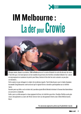 RÉCIT IM Melbourne : La der pour Crowie Chaque année, depuis sa création, l’IM de Melbourne est le centre d’intérêt de cette fin du mois de mars. Il faut dire que c’est une épreuve où bon nombre de pointures du triathlon entendent débuter leur saison en engrangeant un maximum de points pour Kona, histoire d’aborder les mois suivants un peu plus sereinement... Cette année n’a pas échappé à la règle à de nombreux égards. Tout d’abord parce que le triple champion du monde Craig Alexander avait annoncé qu’il s’agirait là de sa dernière participation sur un full dis- tance. Ensuite parce qu’elle a vu la victoire du Luxembourgeois Dirck Bockel résistant à l’assaut des Australiens en surnombre à domicile. Enfin, parce qu’elle marque le retour gagnant de Xena, la triathlète guerrière, Caroline Steffen après plu- sieurs changements au cours de l’hiver dernier dont un changement d’entraîneur (Chris McCormack). Récit Par Jacvan avec organisation, photos Jay_Prasuhn@droits-réservés 37