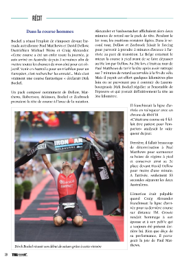 RÉCIT Dans la course hommes Alexander et Vanhoenacker affichaient alors deux minutes de retard sur le pack de tête. Pendant le Bockel a réussi l’exploit de s’imposer devant l’ar- 1er tour, les positions restaient figées. Dans le se- mada autralienne Paul Matthews et David Dellow, cond tour, Dellow et Zeebroek faisait le forcing l’Autrichien Michael Weiss et Craig Alexander. pour parvenir à prendre 2 minutes d’avance à l’ar- «Cette course a été un enfer toute la journée, je rivée au parc de transition. Le Belge entamait le suis arrivé en Australie depuis 3 semaines afin de mieux la course à pied avant de se faire dépasser mettre toutes les chances de mon côté pour cet ob- au 15e km par Dellow. Au 28e km, c’était au tour de jectif. Venir en Australie pour un triathlon pour un Paul Matthews de tenir la tête après avoir rattrapé Européen, c’est rechercher les ennuis!... Mais c’est ses 7 minutes de retard accumulés à la fin du vélo. vraiment une course fantastique « déclarait Dirk Mais il payait cet effort quelques kilomètres plus Bockel. loin en ne parvenant pas à contenir du Luxem- bourgeaois Dirk Bockel régulier sr l’ensemble de Un pack composé notamment de Dellow, Mat- l’épreuve et qui prenait définitivement la tête au thews, Robertson, Atkinson, Bockel et Zeebroek 36e kilomètre. prenaient la tête de course à l’issue de la natation. Il franchissait la ligne d’ar- rivée en vainqueur avec un chrono de 8h01’01 «C’était une course où il fal- lait être patient pour l’em- porter» analysait le vain- queur du jour. Derrière, il fallait beaucoup de détermination à Paul Matthews pour surmonter sa baisse de régime à pied et conserver ainsi sa 2e place devant David Dellow pour moins d’une minute. A l’arrivée, seulement 53 secondes séparent les deux Australiens. L’émotion était palpable quand Craig Alexander franchissait la ligne d’arri- vée pour sa dernière course sur distance IM. Crowie rendait hommage à son épouse et à son public qui a toujours été présent der- rière lui. Bien que déçu de sa performance, il parta- geait la joie de Paul Mat- Dirck Bockel réussit son début de saison grâce à cette victoire thews. 38
