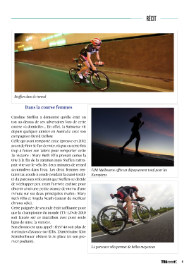 RÉCIT Steffen dans le tunnel Dans la course femmes Caroline Steffen a démontré qu’elle était un ton au-dessus de ses adversaires lors de cette course «à domicile»... En effet, la Suissesse vit depuis quelques années en Australie avec son compagnon David Dellow. Celle qui avait remporté cette épreuve en 2012 avant de finir 3e l’an dernier, n’a pas eu cette fois trop à forcer son talent pour remporter cette 2e victoire : Mary Beth Ellis prenait certes la tête à la fin de la natation mais Steffen rattra- pait vite sur le vélo les deux minutes de retard accumulées dans l’eau. Les deux femmes res- l’IM Melbourne offre un dépaysement total pour les taient au coude à coude pendant la quasi-totali- Européens té du parcours vélo avant que Steffen ne décide de s’échapper peu avant l’arrivée cycliste pour obtenir ainsi une petite avance de moins d’une minute sur ses deux principales rivales : Mary Beth Ellis et Angela Neath (auteur du meilleur chrono vélo). Cette poignée de seconde était suffisante pour que la championne du monde ITU LD de 2010 soit lancée sur ce marathon avec pour seule ligne de mire, la victoire. Son chrono est sans appel : 8h57’46 soit plus de 4 minutes d’avance sur Ellis. L’Américaine Kim Scwabenbauer obtient la 3e place (et son pre- mier podium). Le parcours vélo permet de belles moyennes 41