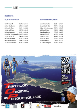 RÉCIT RESULTS : TOP 10 PRO MEN TOP 10 PRO WOMEN 1.Dirk Bockel (LUX) 8:01:01 1.Caroline Steffen (SUI) 8:57:56 2.Paul Matthews (AUS) 8:02:13 2.Mary Beth Ellis (USA) 9:02:14 3.David Dellow (AUS) 8:03:06 3.Kim Schwabenbauer (USA) 9:10:05 4.Michael Weiss (AUT) 8:03:45 4.Rebekah Keat (AUS) 9:11:05 5.Craig Alexander (AUS) 8:05:46 5.Asa Lundstrom (SWE) 9:16:08 6.Marino Vanhoenacker(BEL) 8:08:24 6.Angela Naeth (CAN) 9:21:10 7.Axel Zeebroek (BEL) 8:12:34 7.Mareen Hufe (GER) 9:21:39 8.Christian Kemp (AUS) 8:14:09 8.Simone Boag (AUS) 9:31:19 9.Christian Kramer (GER) 8:15:09 9.Rosie Oldham (AUS) 9:32:33 10. Peter Robertson (AUS) 8:16:29 10.Jessica Simpson (AUS) 9:34:07 42