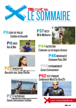 N°128 LE SOMMAIRE P37 RÉCIT P6 COUP DE PROJO Triathlon de Deauville IM de Melbourne P11 UNSS Run & Bike P44 NUTRITION S’alimenter sur de longues distance P46 NOUVEAUTÉ Évènement Polar 2014 P50 ENTRAINEMENT P20 RENCONTRE Carnet d’entrainement Rencontre avec Jenny Fletcher P52 TEST PRODUIT Combinaison Mach3 by Dare2Tri P29 REPORTAGE Cannes International Triathlon www.trimaxhebdo.com 5