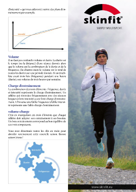 d’intensité » qui vous aideront à suivre des plans d’en- trainement par exemple. Volume Il ne faut pas confondre volume et durée. La durée est le temps (ou la distance) d’une séance donnée alors que le volume est la combinaison de la durée et de la fréquence. En d’autres mots le volume est le total de toutes les durées sur une période donnée. Si un triath- lète court trois fois (fréquence) pendant une heure (durée), son volume de trois heures par semaine. Charge d’entrainement La combinaison des trois éléments : fréquence, durée et intensité représente la charge d’entrainement. Un athlète qui s’entraine fréquemment avec des séances longues à forte intensité a une forte charge d’entraine- ment. A l’inverse une faible fréquence à faible intensi- té représente une faible charge d’entrainement. volume-charge C’est en manipulant ces trois éléments que chaque athlète doit adapter son entrainement à ses besoins. Un bon entrainement correspond au bon équilibre de ces trois composants. Vous avez désormais toutes les clés en main pour aborder sereinement cette nouvelle saison. Bonne saison à tous ! www.skinft.eu