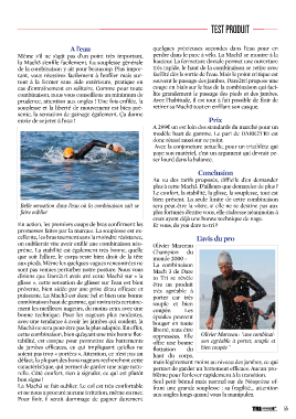 TEST PRODUIT A l’eau quelques précieuses secondes dans l’eau pour en Même s’il ne s’agit pas d’un point très important, perdre dans le parc à vélo. La Mach3 se montre à la la Mach3 s’enfile facilement. La souplesse générale hauteur. La fermeture dorsale permet une ouverture de la combinaison y ait pour beaucoup. Plus impor- très rapide, le haut de la combinaison se retire avec tant, vous réussirez facilement à l’enfiler mais sur- facilité dès la sortie de l’eau. Mais le point critique est tout à la fermer sans aide extérieure, pratique en souvent le passage des jambes, Dare2tri propose une cas d’entraînement en solitaire. Comme pour toute coupe en biais sur le bas de la combinaison qui faci- combinaison, nous vous conseillons un minimum de lite grandement le passage des pieds et des jambes. prudence, attention aux ongles ! Une fois enfilée, la Avec l’habitude, il est tout à fait possible de finir de souplesse et la liberté de mouvement est bien pré- retirer sa Mach3 tout en enfilant son casque. sente, la sensation de gainage également. Ça donne envie de se jeter à l’eau ! Prix A 299€ on est loin des standards du marché pour un modèle haut de gamme. Le pari de DARE2TRI est donc réussi aussi sur ce point. Avec la conjoncture actuelle, pour un triathlète qui paye son matériel, c’est un argument qui devrait pe- ser lourd dans la balance. Conclusion Au vu des tarifs proposés, difficile d’en demander plus à cette Mach3. D’ailleurs que demander de plus ? Le confort, la stabilité, la glisse, la souplesse, tout est bien présent. La seule limite de cette combinaison Belle sensation dans l’eau où la combinaison sait se sera peut-être la vôtre, si elle ne se destine pas aux faire oublier plus fortunés d’entre vous, elle s’adresse néanmoins à ceux ayant déjà une bonne technique de nage. En action, les premiers coups de bras confirment les Et vous, do you dare to tri ? promesses faites par la marque. La souplesse est ex- cellente, les bras tournent sans la moindre résistance, L’avis du pro on oublierait vite avoir enfilé une combinaison néo- Olivier Marceau prène. La stabilité est également très bonne, quelle Champion du que soit l’allure, le corps reste bien droit de la tête monde 2000 : aux pieds. Même les quelques vagues rencontrées ne La combinaison sont pas venues perturber notre posture. Nous vous Mach 3 de Dare disions que Dare2tri avait axé cette Mach3 sur « la to Tri se révèle glisse », cette sensation de glisser sur l’eau est bien être un produit présente, bien aidée par une prise d’eau efficace et très agréable à puissante. La Mach3 est donc bel et bien une bonne porter car très combinaison haut de gamme, qui ravira très certaine- souple et bien ment les meilleurs nageurs, du moins ceux avec une coupée. Les bonne technique. Pour les nageurs plus modestes, épaules peuvent avec une tendance à avoir les jambes qui coulent, la bouger en toute Mach3 ne sera peut-être pas la plus adaptée. En effet, liberté, sans être cette combinaison, bien qu’ayant une très bonne flot- oppressées. Elle Olivier Marceau : "une combinai- tabilité, est conçue pour permettre des battements offre une bonne son agréable à porter, souple et de jambes efficaces, ce qui impliquent qu’elles ne flottaison du bien coupée " soient pas trop « portées ». Attention, ce n’est pas un haut du corps, défaut, la plupart des bons nageurs recherchent cette mais légèrement moins au niveau des jambes, ce qui caractéristique, qui permet de garder une nage natu- permet de garder un battement efficace. Aucun pro- relle. Côté confort, rien à signaler, ce qui est plutôt blème pour l’enlever rapidement à la transition. bon signe ! Seul petit bémol mais normal sur du Néoprène of- La Mach3 se fait oublier. Le col est très confortable frant une grande souplesse : sa fragilité... attention et ne nous a procuré aucune irritation, même en mer. aux ongles longs quand vous la manipulez. Pour finir, il serait dommage de gagner durement 55