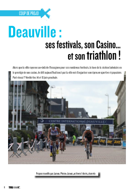 COUP DE PROJO Deauville : ses festivals, son Casino… et son triathlon ! Alors que la ville rayonne au-delà de l’hexagone pour ses nombreux festivals, le luxe de la station balnéaire ou le prestige de son casino, le défi aujourd’hui lancé par la ville est d’organiser une épreuve sportive et populaire. Pari réussi ? Verdict les 14 et 15 juin prochain. Propos recueillis par Jacvan, Photos Jacvan_archives©droits_réservés 6