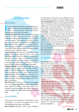 IRONMAN LES HOMMES l’ironman France en juin, sera un athlète à suivre, il reste faible en natation, mais très solide ensuite. LES FAVORIS : Tyler Butterfield (2ème à Cozumel), qui a terminé 7ème l’an dernier revient avec plus d’expérience, il ls sont tellement nombreux à prétendre au po- calcule tout, très fin tacticien de l’entrainement et dium et la victoire qu’il est difficile de faire des de la course, il est fort dans les 3 disciplines et a Ichoix … mais on retrouve souvent les mêmes remporté le triathlon d’Abu Dhabi cette année. pronostics dans les milieux éclairés… Yvan Raña, s’était classé 6ème l’an dernier pour Si Frederik Van Lierde (2ème à Francfort) n’a pas sa première expérience. Cette année, il vient pour connu la même saison que 2013, avec quelques gagner. Avec un profil nageur/ coureur, et dans un 4ème place notamment à Cannes et Aix, il a quand bon jour, il peut suivre les meilleurs à vélo… même remporté 2 half distance et a pris la 2ème James Cunnama, 4ème en 2013, a brillé par son ab- place sur l’Ironman de Francfort le 6 juillet en sence en 2014, mais peut-être pour mieux se pré- 8h01. Il faudra donc compter sur lui : pas de bles- parer et changer son approche de cette épreuve, sure et un gros travailleur… Il a notamment passé sans courir de partout il sera peut-être plus frais 3 semaines à Font-Romeu. Rien n’est jamais laissé qu’à son habitude … au hasard par le champion belge. Bevan Docherty avait abandonné en 2013 pour sa Luke Mc Kenzie avait surpris en 2013 avec sa ma- 1ère participation, il s’est fait plutôt discret cette gnifique 2ème place, après un vélo en tête et un année, en prenant un peu plus d’expérience … marathon solide. Discret en 2014, il a connu deux déceptions sur IM : 13ème à Melbourne et 10ème LES ROOKIES : à Roth alors qu’il était bien préparé. Cependant, il ne faudra pas l’enterrer trop vite car il a l’expé- Jan Frodeno fera ses débuts à Kona, pour seu- rience et le bon âge pour performer à nouveau. lement son 2ème Ironman. Il a terminé 3ème à Sebastian Kienle (Victoire à Francfort) sera éga- Francfort avec le meilleur temps au marathon, lement parmi les favoris, 4ème en 2012, 3ème en mais surtout après 2 crevaisons. Il va nager de- 2013, il prend de l’expérience, nage mieux, gère vant, s’il gère un bon vélo, il sera dangereux au ma- mieux son parcours vélo et peut courir très vite. rathon. Une grosse saison sur le circuit 70.3 avec Cependant côté forme, malgré une victoire et un 2 victoires sur les championnats régionaux et des sub8 à Francfort, il est passé à côté des champion- chronos de 1h11 et 1h12 au semi, il est vice-cham- nats du Monde 70.3 qu’il avait remporté les 2 an- pion du monde 70.3 derrière l’intouchable Javier nées précédentes. Gomez. Tim O’Donnell, l’Américain champion du Monde Victor Del Corral n’est pas un débutant, mais à ITU, a eu du mal à ses débuts à Kona, mais semble Kona ce sera sa 1ère, il est faible en natation, d’au- avoir trouvé le rythme, sans doute grâce aux tant plus sans combi, mais il a prouvé qu’il pouvait conseils de son épouse Mirinda Carfrae qui a rem- rouler très vite, et le marathon est son point fort… porté l’épreuve deux fois. Il avait terminé 5ème en Il a remporté deux Ironman à 6 jours d’intervalle 2013. fin 2013. Filip Ospaly a le profil type de l’athlète du court… LES OUTSIDERS : Il sera sans doute handicapé par son inexpérience à Kona et sur Ironman, et il n’est plus tout jeune, Si les favoris sont nombreux, les outsiders le sont tout comme Pete Robertson, triple champion du encore plus ! La victoire est possible mais le Top Monde ITU, mais qui en plus s’est cassé la clavi- 10 pratiquement sûr pour ces athlètes. cule mi-septembre … Bart Aernouts (Victoire à Nice), qui a remporté 27 TRIhebdo