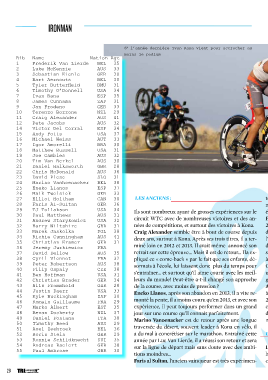 IRONMAN e 6 l’année dernière Yvan Rana vient pour accrocher au moins le podium Bib Name Nation Age 1 Frederik Van Lierde BEL 35 2 Luke McKenzie AUS 33 3 Sebastian Kienle GER 30 4 Bart Aernouts BEL 30 5 Tyler Butterfeld BMU 31 6 Timothy O’Donnell USA 34 7 Ivan Rana ESP 35 8 James Cunnama ZAF 31 9 Jan Frodeno GER 33 10 Terenzo Bozzone NZL 29 11 Craig Alexander AUS 41 12 Pete Jacobs AUS 32 14 Victor Del Corral ESP 34 15 Andy Potts USA 37 16 Michael Weiss AUT 33 17 Igor Amorelli BRA 30 18 Matthew Russell USA 31 19 Joe Gambles AUS 32 20 Tim Van Berkel AUS 30 21 Daniel Halksworth GBR 28 22 Chris McDonald AUS 36 23 David Plese SLO 31 24 Marino Vanhoenacker BEL 38 25 Eneko Llanos ESP 37 26 Maik Twelsiek GER 33 27 Elliot Holtham CAN 30 LES ANCIENS : té avec de nombreux top 10 à Kona, mais son profil 28 Faris Al-Sultan GER 36 nageur/rouleur ne lui suffit plus pour remporter cette 29 TJ Tollakson USA 34 Ils sont nombreux ayant de grosses expériences sur le épreuve. 30 Paul Matthews AUS 31 31 Andrew Starykowicz USA 32 circuit WTC avec de nombreuses victoires et des an- Pete Jacobs a brillé également par son absence en 32 Harry Wiltshire GBR 31 nées de compétitions, et surtout des victoires à Kona. 2013, il valide sa qualification à Zurich avec un chrono 33 Marek Jaskolka POL 38 Craig Alexander semble être à bout de course depuis d’amateur. Il connait parfaitement cette course pour 34 Richie Cunningham AUS 41 deux ans, surtout à Kona. Après ses trois titres, il a ter- l’avoir terminé de nombreuses fois et surtout un po- 35 Christian Kramer GER 31 36 Jeremy Jurkiewicz FRA miné loin en 2012 et 2013. Il avait même annoncé son dium et une victoire. Son profil nageur/ coureur peut 37 David Dellow AUS 35 retrait sur cette épreuve… Mais il est de retour… Ila ex- s’avérer payant lorsqu’il arrive à suivre le bon groupe 38 Cyril Viennot FRA 32 pliqué ce « come-back » par le fait que ses enfants, dé- à vélo. Capable de sortir un marathon en 2h40 à Kona. 39 Peter Robertson AUS 38 sormais à l’école, lui laissent donc plus du temps pour Cependant depuis sa victoire en 2012 il semble avoir 40 Filip Ospaly CZE 38 s’entraîner… et surtout qu’il aime courir avec les meil- un peu changé de comportement et prendre un peu la 41 Ben Hoffman USA 31 42 Christian Brader GER 34 leurs du monde! Peut-être a-t-il changé son approche grosse tête ! Ce qui ne lui réussit pas finalement… 43 Nils Frommhold GER 28 de la course, avec moins de pression ? Andreas Raelert, blessé en 2013, contraint à l’abandon 44 Justin Daerr USA 33 Eneko Llanos, après son abandon en 2013, il a vite re- à Kona, il a eu du mal à revenir au top de sa forme en 45 Kyle Buckingham ZAF 30 monté la pente, il a moins couru qu’en 2013, et avec son 2014 et prend la qualification sur le fil en août avec sa 46 Romain Guillaume FRA 29 47 Marko Albert EST 35 expérience, il peut toujours performer dans un grand course de Mont Tremblant. Ila une grosse expérience 48 Bevan Docherty NZL 37 jour sur une course qu’il connait parfaitement. de cette épreuve avec 3 podiums et un DNF à Kona, 49 Daniel Fontana ITA 38 Marino Vanoenacker est de retour après une longue mais il manquera sans doute de fraîcheur. 50 Timothy Reed AUS 29 traversée du désert, souvent leader à Kona en vélo, il 51 Axel Zeebroek BEL 36 52 Boris Stein GER 29 a du mal à concrétiser sur le marathon. Entraîné cette LES FRANÇAIS : 53 Ronnie Schildknecht SUI 35 année par Luc Van Lierde, il a réussi son retour et sera 54 Andreas Raelert GER 38 sur la ligne de départ mais sans doute avec des ambi- Les Français sont de retour en force sur la côte 55 Paul Ambrose GBR 30 tions moindres… hawaiienne, avec 3 prétendants au Top 10 … Mais pour Faris al Sultan, l’ancien vainqueur est très expérimen- cela il leur faudra sortir le grand jeu ! 28 TRIhebdo