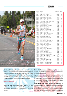 IRONMAN Bib Name Nation Age 101 Mirinda Carfrae AUS 33 102 Rachel Joyce GBR 36 103 Meredith Kessler USA 36 104 Liz Blatchford GBR 34 105 Caroline Steffen SUI 36 106 Gina Crawford NZL 33 107 Yvonne Van Vlerken NED 35 108 Linsey Corbin USA 33 109 Caitlin Snow USA 32 110 Elizabeth Lyles USA 36 111 Leanda Cave GBR 36 112 Daniela Ryf SUI 27 113 Amber Ferreira USA 32 114 Melissa Hauschildt AUS 31 115 Sara Gross CAN 38 116 Catriona Morrison GBR 37 117 Mary Beth Ellis USA 37 118 Melanie Burke NZL 119 Asa Lundstroem SWE 30 120 Beth Shutt USA 35 121 Michelle Vesterby DEN 31 122 Kristin Moeller GER 30 123 Lucy Gossage GBR 34 124 Amanda Stevens USA 37 125 Jodie Swallow GBR 33 126 Sofe Goos BEL 34 127 Natascha Badmann SUI 47 128 Julia Gajer GER 32 129 Lisa Roberts USA 35 130 Corinne Abraham GBR 36 131 Simone Braendli SUI 34 132 Jackie Arendt USA 30 133 Kim Schwabenbauer USA 35 134 Bree Wee USA 34 135 Jessie Donavan USA 38 136 Heather Wurtele CAN 35 137 Kelly Williamson USA 36 Mirinda Carfrae a remporté 2 fois l’Ironman d’Hawaii... 138 Katja Konschak GER 36 en quête d’une nouvelle victoire Corinne Abraham, l’Anglaise sera pour la 1ère fois Meredith Kessler, une athlète complète qui prend à Kona, elle a montré une grande régularité depuis de plus en plus d’expérience et qui peut encore ve- 2010, n’a jamais terminé au-delà de la 4ème place nir titiller le podium. sur IM. Elle a remporté l’IM de Francfort en juil- Catriona Morrison, absente pratiquement 16 mois let et Melbourne en 2013, prouvant ainsi qu’il fallait pour une blessure à la cheville, l’Ecossaise n’a ja- compter sur elle et qu’elle est prête pour Kona mais vraiment brillé à Kona, elle est régulière à vélo et à pied. Elle vient de passer à travers les cham- LES OUTSIDERS pionnats du Monde 70.3 Mary Beth Ellis, après avoir tout remporté ou Michelle Vesterby, régulièrement placée, c’est une presque, Hawaii est la seule épreuve qui lui résiste, athlète complète. 8ème en 2013, elle a le même en- 15ème puis 5ème en 2012, elle a abandonné l’an der- traîneur et manager que Frederik Van Lierde, un nier victime d’une chute à vélo courant septembre signe ? elle était loin d’être à 100%... 2ème à Melbourne, 31 TRIhebdo