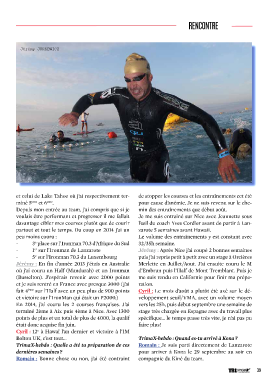 RENCONTRE Jérémy JURKEWICZ et celui de Lake Tahoe où j’ai respectivement ter- de stopper les courses et les entraînements cet été miné 5 eme et 6 eme . pour cause d’anémie. Je ne suis revenu sur le che- Depuis mon entrée au team, j’ai compris que si je min des entraînements que début août. voulais être performant et progresser il me fallait Je me suis entraîné sur Nice avec Jeannette sous davantage cibler mes courses plutôt que de courir l’œil du coach Yves Cordier avant de partir à Lan- partout et tout le temps. Du coup en 2014 j’ai un zarote 5 semaines avant Hawaii. peu moins couru : Le volume des entraînements y est constant avec - 3 place sur l’Ironman 70.3 d’Afrique du Sud 32/35h semaine. e - 1 sur l’Ironman de Lanzarote Jérémy : Après Nice j’ai coupé 2 bonnes semaines er - 5 sur l’Ironman 70.3 du Luxembourg puis j’ai repris petit à petit avec un stage à Orcières e Jérémy : En fin d’année 2013 j’étais en Australie Merlette en Juillet/Aout. J’ai ensuite couru le M où j’ai couru un Half (Mandurah) et un Ironman d’Embrun puis l’Half de Mont Tremblant. Puis je (Busselton). J’espérais revenir avec 2000 points me suis rendu en Californie pour finir ma prépa- et je suis rentré en France avec presque 3000 (j’ai ration. fait 4 ème sur l’Half avec un peu plus de 900 points Cyril : Le mois d’août a plutôt été axé sur le dé- et victoire sur l’IronMan qui était un P2000.) veloppement seuil/VMA, avec un volume moyen En 2014, j’ai couru les 2 courses françaises. J’ai vers les 25h, puis début septembre une semaine de terminé 2ème à Aix puis 4ème à Nice. Avec 1300 stage très chargée en Espagne avec du travail plus points de plus et un total de plus de 4000, la qualif spécifique... le temps passe très vite, je n’ai pas pu était donc acquise fin juin. faire plus! Cyril : 12 à Hawaï l’an dernier et victoire à l’IM e Bolton UK, c’est tout... TrimaX-hebdo : Quand es-tu arrivé à Kona ? TrimaX-hebdo : Quelle a été ta préparation de ces Romain : Je suis parti directement de Lanzarote dernières semaines ? pour arriver à Kona le 29 septembre au soir en Romain : Bonne chose ou non, j’ai été contraint compagnie du Kiné du team. 39 TRIhebdo