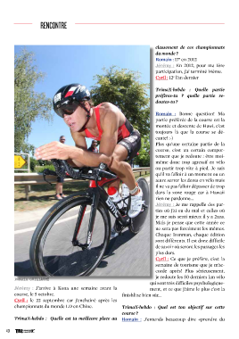 RENCONTRE classement de ces championnats du monde ? e Romain : 17 en 2012 Jérémy : En 2012, pour ma 1ère participation, j’ai terminé 14ème. e Cyril : 12 l’an dernier TrimaX-hebdo : Quelle partie préfères-tu ? quelle partie re- doutes-tu ? Romain : Bonne question! Ma partie préférée de la course est la montée et descente de Hawi, c’est toujours là que la course se dé- cante! :-) Plus qu’une certaine partie de la course, c’est un certain compor- tement que je redoute : être moi- même donc trop agressif en vélo ou partir trop vite à pied. Je sais qu’il va falloir à un moment ou un autre serrer les dents en vélo mais il ne va pas falloir dépasser de trop dans la zone rouge car à Hawaii rien ne pardonne... Jérémy : Je me rappelle des par- ties où j’ai eu du mal et celles où je me suis senti mieux il y a 2ans. Mais je pense que cette année ce ne sera pas forcément les mêmes. Chaque Ironman, chaque édition sont différents. Il est donc difficile de savoir où seront les passages les plus durs. Cyril : Ce que je préfère, c’est la semaine de tourisme que je m’ac- corde après! Plus sérieusement, je redoute les 50 derniers km vélo Romain GUILLAUME qui sont très difficiles psychologique- Jérémy : J’arrive à Kona une semaine avant la ment, et ce que j’aime le plus c’est la course, le 5 octobre. finishline bien sûr... Cyril : le 22 septembre car j’enchaîné après les championnats du monde LD en Chine. TrimaX-hebdo : Quel est ton objectif sur cette course ? TrimaX-hebdo : Quelle est ta meilleure place au Romain : J’entends beaucoup dire «prendre du 40 TRIhebdo