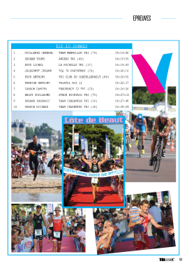 EPREUVES TOP 10 HOMMES 1 OUILLERES GWENAEL TEAM MERMILLOD TRI (74) 04:14:00 2 DEGHAM TOUMY ANGERS TRI (49) 04:15:55 3 ROYE LIONEL LA ROCHELLE TRI (17) 04:19:03 4 JOUSSEMET JEROME TCG 79 PARTHENAY (79) 04:20:16 5 FAYE ANTHONY TRI CLUB DE CHATELLERAULT (86) 04:20:55 6 PANNIER ANTHONY TRIATHL AIX () 04:22:37 7 LANDON DAMIEN ENDURANCE 72 TRI (72) 04:24:56 8 BELGY GUILLAUME STADE NIORTAIS TRI (79) 04:27:11 9 DURAND FREDERIC TEAM CHARENTES TRI (16) 04:27:46 10 HOBSON RICHARD TEAM CHARENTES TRI (16) 04:29:01 53 TRIhebdo