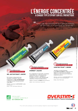 L’ÉNERGIE CONCENTRÉE A CHAQUE TYPE D’EFFORT SON GEL ÉNERGÉTIQUE “ Parce que vos besoins ne sont pas les mêmes en fonction du moment et de l’intensité ! Energie instantanée OVERSTIM.s® - 56890 PLESCOP - 02 97 63 82 61 - www.overstims.com DIETE SPORT FRANCE - PLESCOP - RCS VANNES B 323 784 140 - © TriMax hebdo - Erico d’Ario Idéal pour les passages diciles Energie progressive COUP DE FOUET® LIQUIDE Le gel endurance par excellence Calcium Contribue au bon Magnésium ENERGIX® LIQUIDE Véritable concentré d’énergie, fonctionnement musculaire le gel COUP DE FOUET® s’utilise en cours d’épreuve en prévision d’un passage GEL ANTIOXYDANT LIQUIDE Sa composition en glucides complexes difcile et à l’approche de l’arrivée pour (maltodextrines, sirop de glucose, redonner du punch. dextrose, fructose), vitamines et Par l’action conjuguée de ses minéraux en font un gel parfaitement Utilisation : Consommez 1 gel COUP DE FOUET® au pied d’une difculté et sur les derniers kilomètres. vitamines, minéraux, calcium, adapté aux épreuves d’endurance. magnésium, le GEL ANTIOXYDANT Arômes : Citron, Fruits rouges. contribue au bon fonctionnement Utilisation : Consommez 1 gel ENERGIX® toutes les 45 mn à 1h. musculaire. Arômes : Citron, Fruits des bois, Pomme verte. Utilisation : Consommez 1 gel ANTIOXYDANT en début et à mi-parcours. Arômes : Citron, Fruits rouges, Pomme verte. DÉCOUVREZ LA GAMME OVERSTIM.s® EN VERSION BIO Pour votre santé, pratiquez une activité physique régulière. www.mangerbouger.fr TRI 63 63 63 TRI TRIhebdohebdohebdo pub_gels_trimax_FR.indd 1 15/04/14 09:18