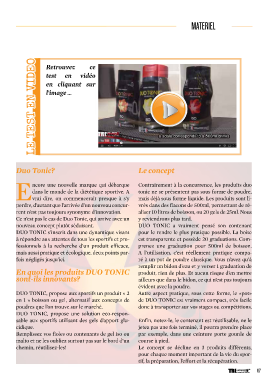 MATERIEL LE TEST EN VIDEO Retrouvez ce test en vidéo en cliquant sur l’image ... Duo Tonic? Le concept ncore une nouvelle marque qui débarque Contrairement à la concurrence, les produits duo dans le monde de la diététique sportive. A tonic ne se présentent pas sous forme de poudre, Evrai dire, on commencerait presque à s’y mais déjà sous forme liquide. Les produits sont li- perdre, d’autant que l’arrivée d’un nouveau concur- vrés dans des flacons de 500ml, permettant de ré- rent n’est pas toujours synonyme d’innovation. aliser 10 litres de boisson, ou 20 gels de 25ml. Nous Ce n’est pas le cas de Duo Tonic, qui arrive avec un y reviendrons plus tard. nouveau concept plutôt séduisant. DUO TONIC a vraiment pensé son contenant DUO TONIC s’inscrit dans une dynamique visant pour le rendre le plus pratique possible. La boîte à répondre aux attentes de tous les sportifs et pro- est transparente et possède 20 graduations. Com- fessionnels à la recherche d’un produit efficace, prenez une graduation pour 500ml de boisson. mais aussi pratique et écologique, deux points par- A l’utilisation, c’est réellement pratique compa- fois négligés jusqu’ici. ré à un pot de poudre classique. Vous n’avez qu’à remplir un bidon d’eau et y verser 1 graduation de En quoi les produits DUO TONIC produit, rien de plus. Et aucun risque d’en mettre sont-ils innovants? ailleurs que dans le bidon, ce qui n’est pas toujours évident avec la poudre. DUO TONIC, propose aux sportifs un produit « 2 Autre aspect pratique, sous cette forme, le «pot» en 1 » boisson ou gel, alternatif aux concepts de de DUO TONIC est vraiment compact, très facile poudres que l’on trouve sur le marché. donc à transporter sur vos stages ou compétitions. DUO TONIC, propose une solution eco-respon- sable aux sportifs utilisant des gels d’apport glu- Enfin, notez-le, le contenant est réutilisable, ne le cidique. jetez pas une fois terminé, il pourra prendre place Remplissez vos fioles ou contenants de gel iso ou par exemple, dans une ceinture porte gourde de malto et ne les oubliez surtout pas sur le bord d’un course à pied. chemin, réutilisez-les! Le concept se décline en 3 produits différents, pour chaque moment important de la vie du spor- tif, la préparation, l’effort et la récupération. 67 TRIhebdo