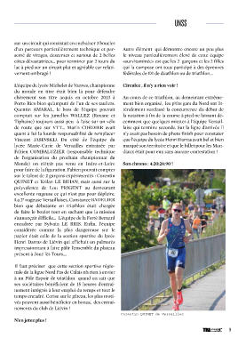 UNSS sur un circuit qui consistait en enchainer 3 boucles d’un parcours particulièrement technique et par- Autre élément qui démontre encore un peu plus semé de virages, descentes et surtout de 2 belles le niveau particulièrement élevé de cette équipe côtes dévastatrices... pour terminer par 2 tours du «survitaminée» est que les 2 garçons et les 2 filles lac à pied sur un circuit plat et agréable car relati- qui la compose ont tous participé à des épreuves vement ombragé ! fédérales de D1 de duathlon ou de triathlon... L’équipe du lycée Michelet de Vanves, championne Circulez , il n’y a rien voir ! du monde en titre était bien là pour défendre chèrement son titre acquis en octobre 2013 à Au cours de ce triathlon, au demeurant extrême- Porto Rico bien qu’amputé de l’un de ses tauliers. ment bien organisé, les p’tits gars du Nord ont lit- Quentin AMARAL, le boss de l’équipe pouvait téralement surclassé la concurrence du début de comptait sur les jumelles WALLEZ (Roxane et la natation à fin de la course à pied ne laissant dé- Tiphaine) toujours aussi peu à l’aise sur un vélo cemment que quelques miettes à l’équipe Versail- de route que sur VTT... Marin CORDIER avait laise qui termine seconde. Sur la ligne d’arrivée il quant à lui la lourde responsabilité de remplacer n’y avait pas besoin de photo finish pour constater Vincent JASINSKIJ. Du côté de l’équipe du que l’équipe du lycée Henri Darras avait bel et bien lycée Marie-Curie de Versailles entrainée par marqué son territoire et que le billet pour les Mon- Fabien COMBALUZIER (responsable technique diaux était pour eux sans aucune contestation ! de l’organisation du prochain championnat du Monde) on n’était pas venu en Indre-et-Loire Son chrono : 4:20:26:90 ! pour faire de la figuration. Fabien pouvait compter sur le talent de 2 garçons expérimentés : Corentin QUINET et Krilan LE BIHAN, mais aussi sur la polyvalence de Lou PRIGENT au demeurant excellente nageuse ce qui n’est pas pour déplaire. e La 2 nageuse Versaillaises, Constance BADELIER bien que débutante en triathlon était chargée de faire le boulot tout en sachant que la mission s’annonçait difficile... L’équipe de la Ferté Bernard encadrée par Sylvain LE BRIS. Enfin, l’équipe considérée comme la plus dangereuse sur le papier était celle de la section sportive du lycée Henri Darras de Liévin qui affichait un palmarès impressionnant à faire pâlir l’ensemble du plateau présent à Joué lès Tours.... Il faut préciser que cette section sportive régio- nale de la ligue Nord Pas de Calais n’a rien à envier à un Pôle Espoir de triathlon quand on sait que ses sociétaires bénéficient de 15 heures d’entrai- nement intégrés à leur emploi du temps et tout le temps encadré. Cerise sur le gâteau, les plus moti- vés peuvent aussi bénéficier en bonus, des entrai- nements du club de Liévin ! Corentin QUINET de Versailles N’en jetez plus ! 9 TRIhebdo
