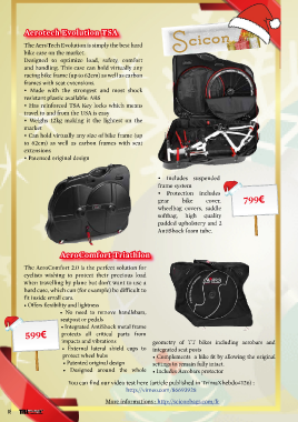 Aerotech Evolution TSA Scicon The AeroTech Evolution is simply the best hard bike case on the market. Designed to optimize load, safety, comfort and handling. This case can hold virtually any racing bike frame (up to 62cm) as well as carbon frames with seat extensions. • Made with the strongest and most shock resistant plastic available: ABS • Has reinforced TSA Key locks which means travel to and from the USA is easy • Weighs 12kg making it the lightest on the market • Can hold virtually any size of bike frame (up to 62cm) as well as carbon frames with seat extensions • Patented original design • Includes suspended frame system • Protection includes gear bike cover, 799€ wheelbag covers, saddle softbag, high quality padded upholstery and 2 AntiShock foam tube. AeroComfort Triathlon The AeroComfort 2.0 is the perfect solution for cyclists wishing to protect their precious load when travelling by plane but don’t want to use a hard case, which can (for example) be difficult to fit inside small cars. • Ofers fexibility and lightness • No need to remove handlebars, seatpost or pedals • Integrated AntiShock metal frame 599€ protects all critical parts from impacts and vibrations geometry of TT bikes including aerobars and • External lateral shield cups to integrated seat posts protect wheel hubs • Complements a bike ft by allowing the original • Patented original design settings to remain fully intact. • Designed around the whole • Includes Aerobars protector You can find our video test here (article published in TrimaXhebdo#126) : http://vimeo.com/86693928 More informations : http://sciconbags.com/fr 18 TRIhebdo