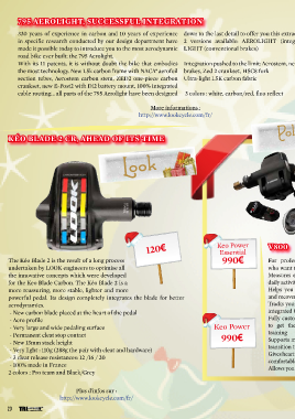 795 AEROLIGHT, SUCCESSFUL INTEGRATION 330 years of experience in carbon and 10 years of experience down to the last detail to offer you this extraordinary machine. in specific research conducted by our design department have 2 versions available: AEROLIGHT (integrated brakes) and made it possible today to introduce you to the most aerodynamic LIGHT (conventional brakes) road bike ever built: the 795 Aerolight. With its 11 patents, it is without doubt the bike that embodies Integration pushed to the limit: Aerostem, new E-Post 2 seatpost, the most technology. New 1.5k carbon frame with NACA* aerofoil brakes, Zed 2 crankset, HSC8 fork section tubes, Aerostem carbon stem, ZED2 one-piece carbon Ultra-light 1.5K carbon fabric crankset, new E-Post2 with Di2 battery mount, 100% integrated cable routing… all parts of the 795 Aerolight have been designed 3 colors : white, carbon/red, fluo reflect More informations : http://www.lookcycle.com/fr/ Polar KÉO BLADE 2 CR, AHEAD OF ITS TIME Look 120€ Keo Power V800 Essential The Kéo Blade 2 is the result of a long process 990€ For professional and devoted athletes undertaken by LOOK engineers to optimise all who want to reach peak performance. the innovative concepts which were developed Measures every training session and 24/7 for the Keo Blade Carbon. The Kéo Blade 2 is a daily activity more reassuring, more stable, lighter and more Helps you understand your training load powerful pedal. Its design completely integrates the blade for better and recovery need aerodynamics. Tracks your speed, distance and route with - New carbon blade placed at the heart of the pedal integrated GPS - Aero profile Fully customisable sport profles - Very large and wide pedaling surface Keo Power to get the most out of your - Permanent cleat stop contact 990€ training - New 13mm stack height Supports multisport training with transition times - Very light : 110g (288g the pair with cleat and hardware) Gives heart rate even in water with a - 3 cleat release resistances: 12 /16 / 20 comfortable dual-mode transmitter - 100% made in France Allows you to plan and analyse your 2 colors : Pro team and Black/Grey Plus d’infos sur : http://www.lookcycle.com/fr/ 20 TRIhebdo