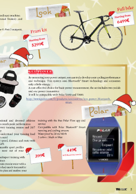 Look Full bike down to the last detail to offer you this extraordinary machine. Starting from 2 versions available: AEROLIGHT (integrated brakes) and 6499€ LIGHT (conventional brakes) Integration pushed to the limit: Aerostem, new E-Post 2 seatpost, Fram kit brakes, Zed 2 crankset, HSC8 fork Ultra-light 1.5K carbon fabric Starting from 3 colors : white, carbon/red, fluo reflect 5299€ Polar KEO POWER By measuring your power output, you can truly develop your cycling performance and technique. This system uses Bluetooth® Smart technology and consumes only a little energy. A cost-effective choice for basic power measurement, the set includes two pedals and one power transmitter. It will be compatible with Polar V650 and V800. http://www.polar.com/fr/produits/accessoires/keo_power_bluetooth_ smart Polar V800 For professional and devoted athletes training with the free Polar Flow app and who want to reach peak performance. service Measures every training session and 24/7 Compatible with Polar Bluetooth® Smart daily activity running and cycling sensors Helps you understand your training load Waterproof to 30 m/100 f and recovery need 2 colors : black or blue Tracks your speed, distance and route with integrated GPS Fully customisable sport profles to get the most out of your 449€ training 399€ with heart rate sensor Supports multisport training with transition times Gives heart rate even in water with a comfortable dual-mode transmitter Allows you to plan and analyse your 21 TRIhebdo
